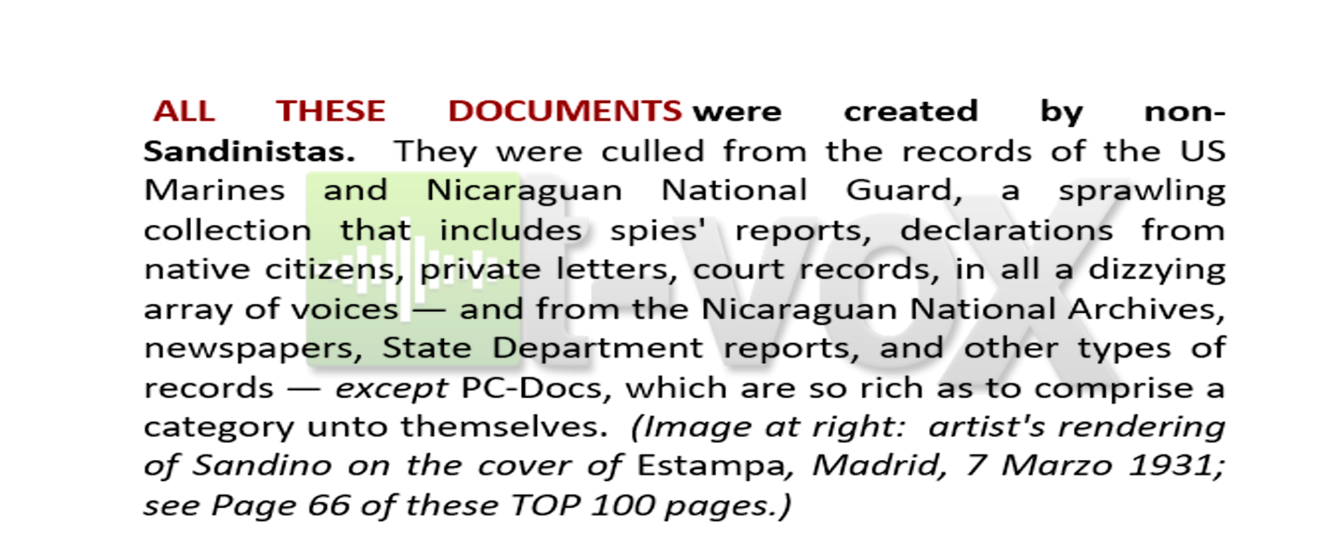 TODOS ESTOS DOCUMENTOS fueron creados por personas no-Sandinistas. Fueron escogidos de registros de los Infantes de Marina de Estados Unidos y la Guardia Nacional de Nicaragua, una colección desmadejada que incluye reportes de espías, declaraciones de ciudadanos nicaragüenses, correspondencia privada, registros de la corte, en suma una increíble variedad de voces – y de los Archivos Nacionales de Nicaragua, periódicos, reportes del Departamento de Estado y otros tipos de registros —excepto documentos PC-Docs, los cuales por su volumen y extensión tan vasta constituyen una categoría en sí mismos. (Imagen a la izquierda: representación de Sandino de una artista en la portada de Estampa, Madrid, 7 Marzo 1931; ver Página 66 de estas páginas TOP 100.)