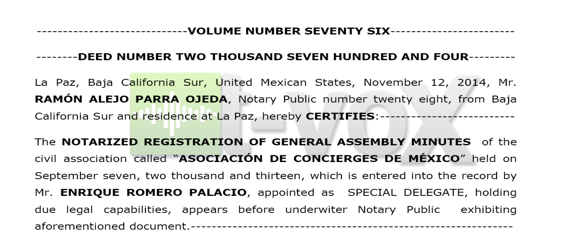 En la Ciudad de La Paz, Baja California Sur, Estados Unidos Mexicanos, a los doce días del mes de Noviembre de dos mil catorce, YO, el licenciado RAMÓN ALEJO PARRA OJEDA, Notario Público Número Veintiocho con ejercicio en el Estado de Baja California Sur y residencia en esta Ciudad de La Paz, por medio del presente instrumento HAGO CONSTAR:-----------------------------------------------------------